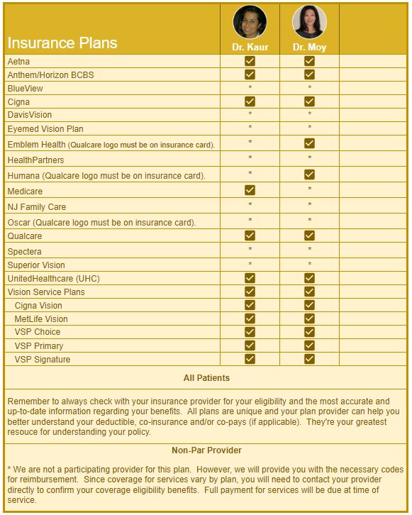 Insurance coverage for eye exams varies. Some plans only pay for routine, well visits. Other insurance plans will cover an exam only if a medical eye condition or disease is present. Knowing the reason for your visit will allow our staff to bill your insurance properly and ensure you are receiving the appropriate care.
